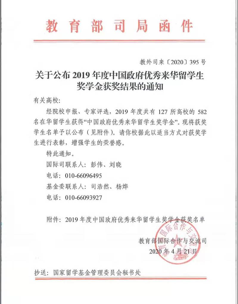 “中国政府优秀来华留学生奖学金”是教育部为扩大中国政府奖学金的辐射面和影响力,培养更多知华、友华的国际优秀人才而设立的奖学金项目,该奖项每年评选一次,由教育部组织专家对推荐人的学业情况、科研能力和在华表现进行评审后产生,因申请人数众多、评审要求严格,名额有限,被视为中国政府授予来华留学生的最高荣誉之一。经专家评审,共有127所高校的582名在华留学生获得2019年度中国政府优秀来华留学生奖学金。我校来华留学生沙巴斯博士在校期间认真学习、潜心研究,凭借优异的学习成绩、积极健康的精神面貌,最终成功获选该奖项!